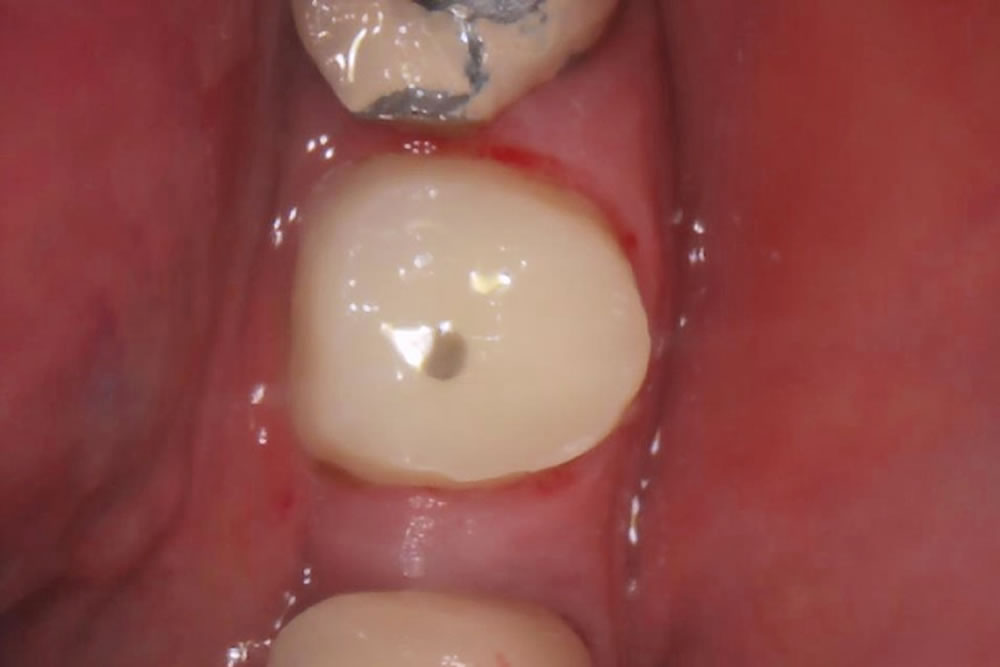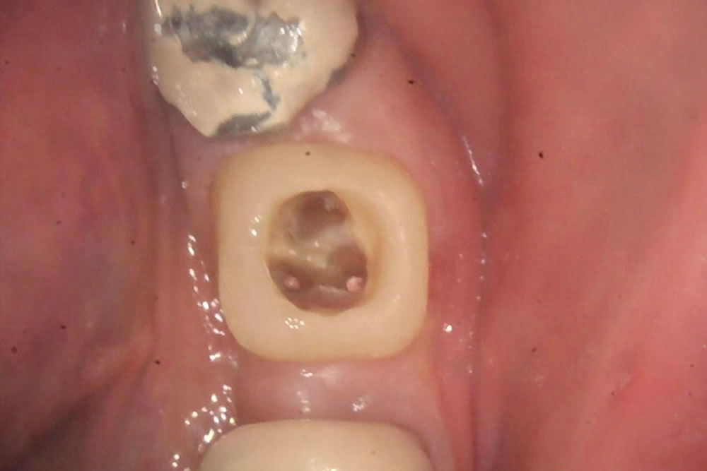 被せ物と土台を外したため、過去に根管治療を行った際のゴム状の材料が見えている状態です。